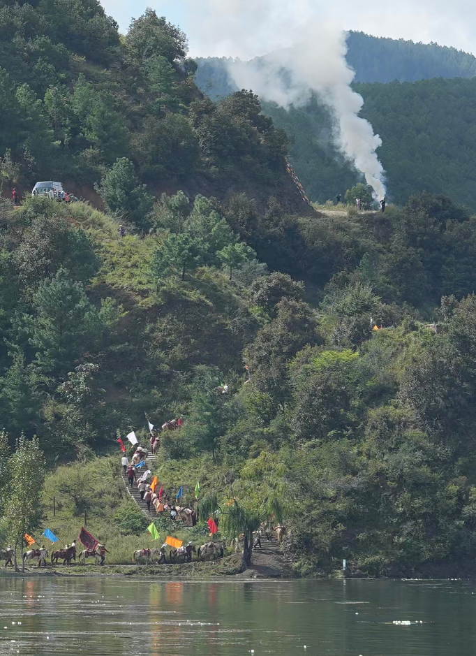 岸边的马队沿着山路前行,构成了一幅人与自然和谐共生的绝美“转山转海”画卷。
